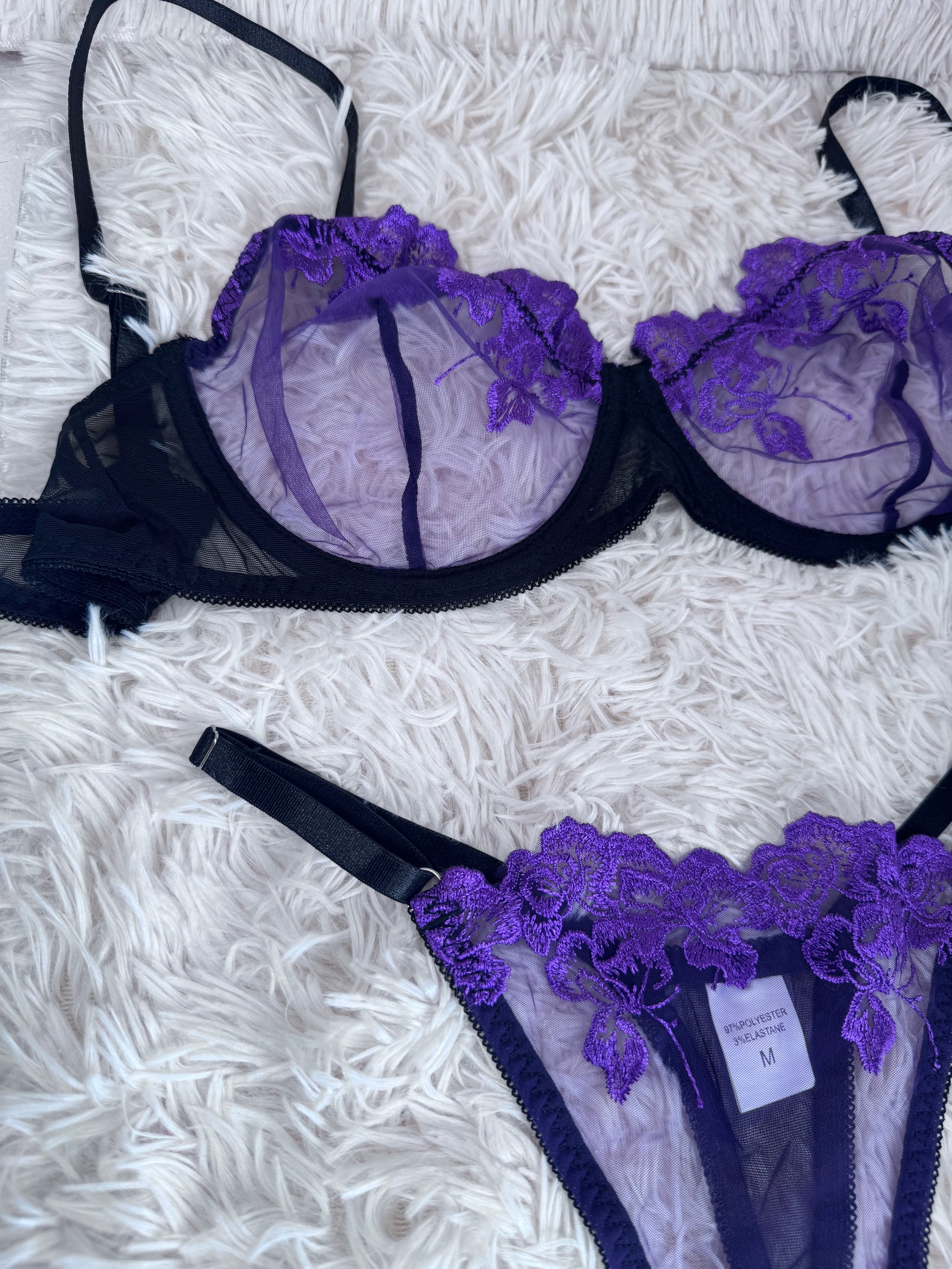 Lindo conjunto talla M con transparencias y flores bordadas.